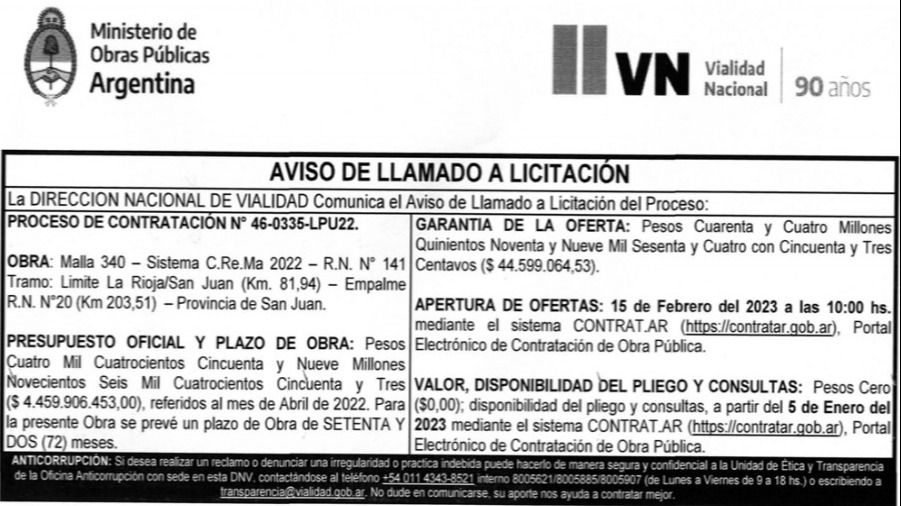 Vialidad Nacional lanzó la licitación de $4.459.906.453 para repavimentar y remozar 120 kilómetros de la Ruta 141 que limita con La Rioja. Estas obras son muy esperadas desde hace años, ya que en los últimos años fue deteriorándose por las crecidas y también fue víctima de una mala administración porque en el gobierno anterior se licitó, pero la empresa ganadora nunca hizo nada.