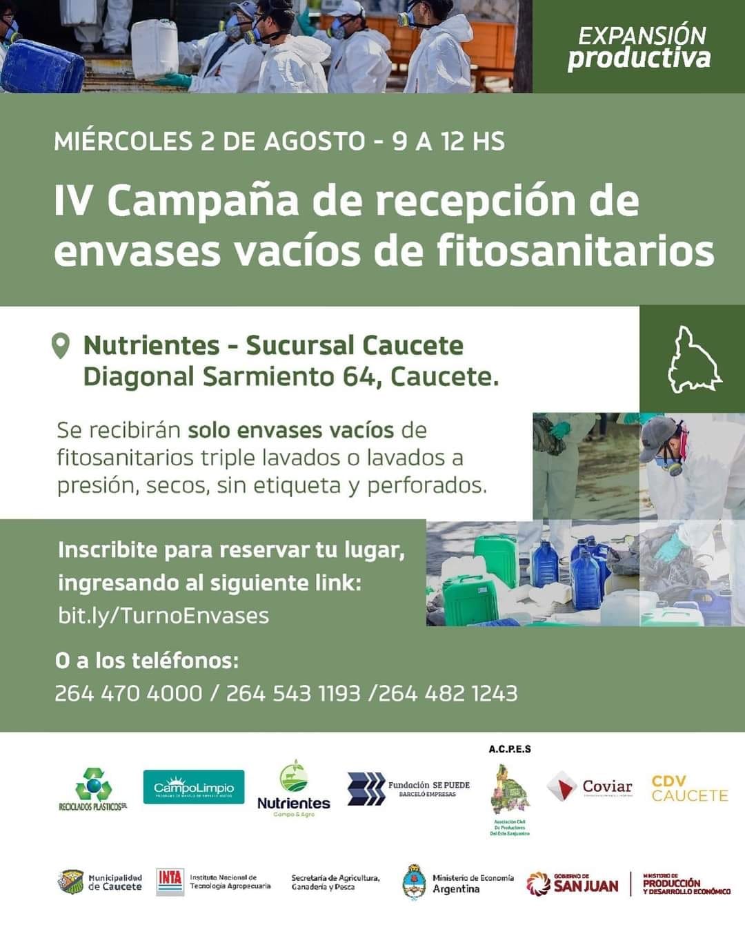 La Agencia de Desarrollo Económico Local y la Subsecretaría Medio Ambiente de la Municipalidad de Caucete articulan dicha campaña con el objetivo de recuperar los envases vacíos de fitosanitarios del campo promoviendo así las buenas prácticas ambientales, acompañando y brindando a los productores herramientas para el tratamiento y la gestión de estos residuos.