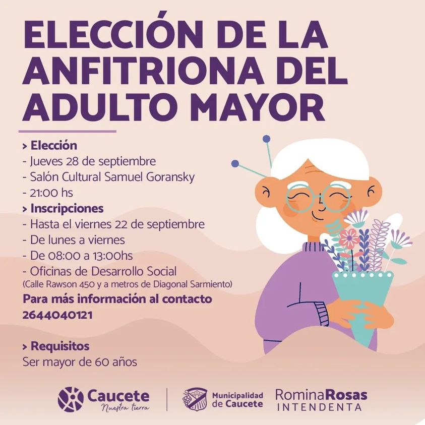 Caucete a través de sus redes sociales anunció que están en búsqueda de la Anfitriona del Adulto Mayor, que será una persona que se convertirá en «vocera de los adultos mayores”. Además será la responsable de “darle la bienvenida” a los visitantes que lleguen al departamento.