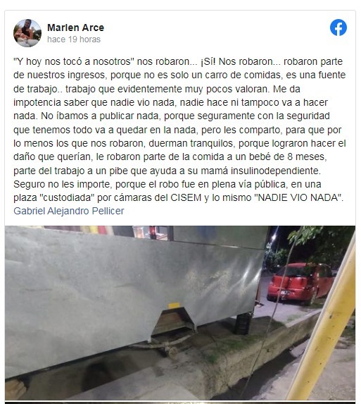 «Hoy nos tocó a nosotros», comenzó Arce, en referencia a los múltiples robos de ruedas que vienen sucediendo en el departamento. «Robaron parte de nuestros ingresos, porque no es solo un carro de comidas, es una fuente de trabajo.. trabajo que evidentemente muy pocos valoran. Me da impotencia saber que nadie vio nada, nadie hace ni tampoco va a hacer nada», siguió.