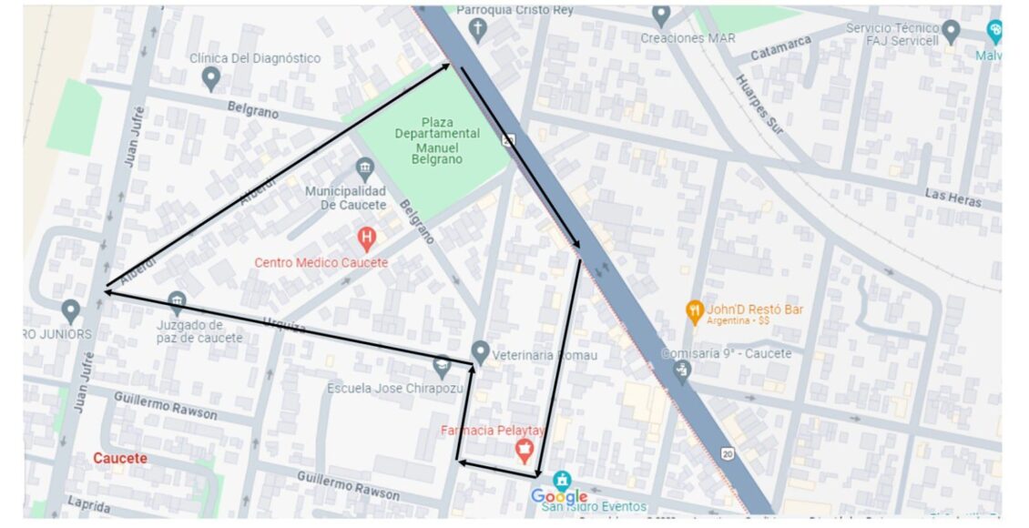 La misma comenzará desde la plaza departamental y por la Diag. Sarmiento se dirigirá hasta Fermin Rodriguez doblando hacia el sur, para luego emplamar con calle Rawson, desde ahi girará hacia la derecha por Calle Ignacio de la Roza,hasta Urquiza, hasta la calle Alberdi y por esta hata la Puerta misma de la Iglesia Cristo Rey.