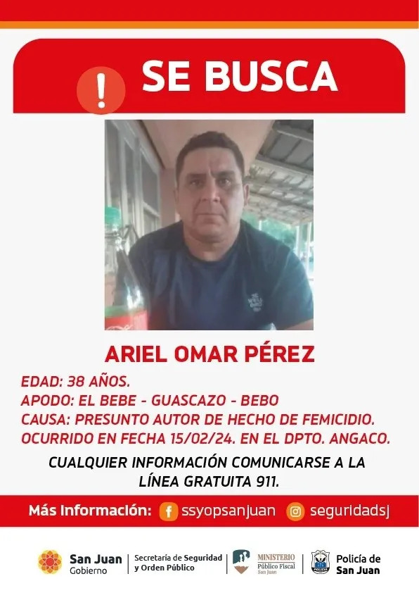 Ariel Omar Pérez está acusado de haber asesinado de al menos 8 puntazos a Yanina Pérez en la puerta del cementerio de Angaco, donde ella trabajaba. Eso fue cerca de las 9.30 de este jueves y desde ese momento el presunto femicida está prófugo.