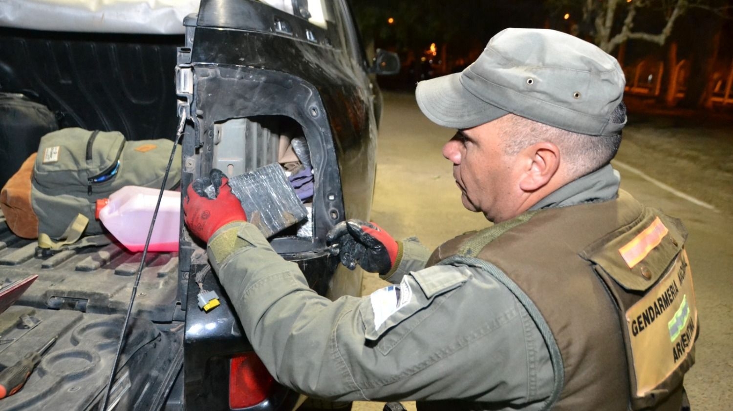 Con el apoyo del perro detector de narcóticos, y ante la reacción del mismo cuando pasaba en diferentes sectores del vehículo, se constató la presencia de 55 paquetes ocultos en paneles laterales y la parte frontal de la camioneta en la que trasladaban.