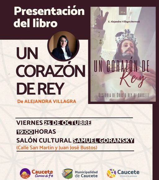 Este viernes 25 de octubre, a las 19 horas, el Salón Cultural de Caucete se vestirá de historias y emociones para recibir la presentación del libro “Un corazón de rey”, La historia de Cristo Rey en Caucete, de la escritora Alejandra Villagra Berroca, quien nos invita a un viaje en el tiempo, a los orígenes de la Parroquia Cristo Rey, un lugar que ha marcado la vida de generaciones en esta tierra sanjuanina.