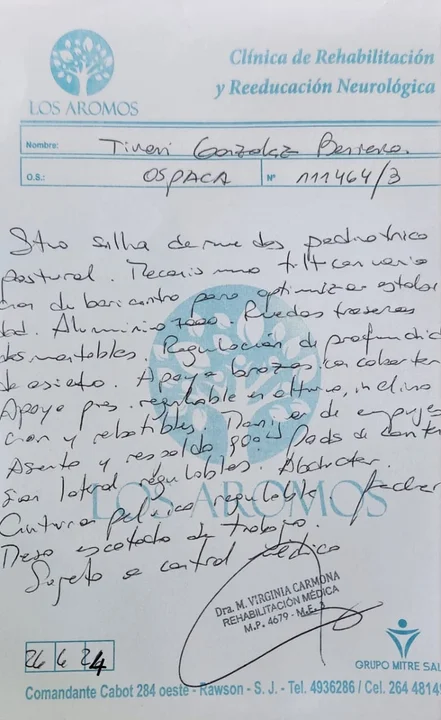 Desde allí le informaron que la silla tenía un valor de 18 millones de pesos, mientras que el bipedestador costaba 9 millones. A esto se suman otros elementos más baratos que son un corset ortopédico y unas férulas para sus extremidades.