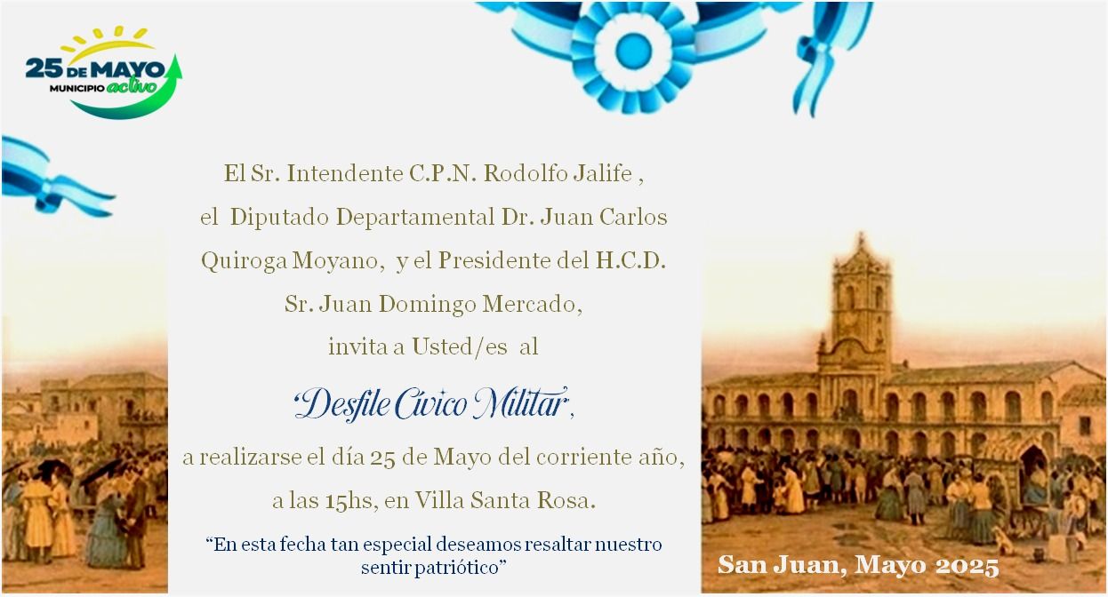 El Sr. Intendente de la Municipalidad de 25 de Mayo c.p.n Rodolfo Jalife invita a toda la comunidad del departamento y de laprovincia de San Juan,  a participar del DESFILE CÍVICO MILITAR que se realizará el próximo domingo  25 de mayo a las 15 hs.