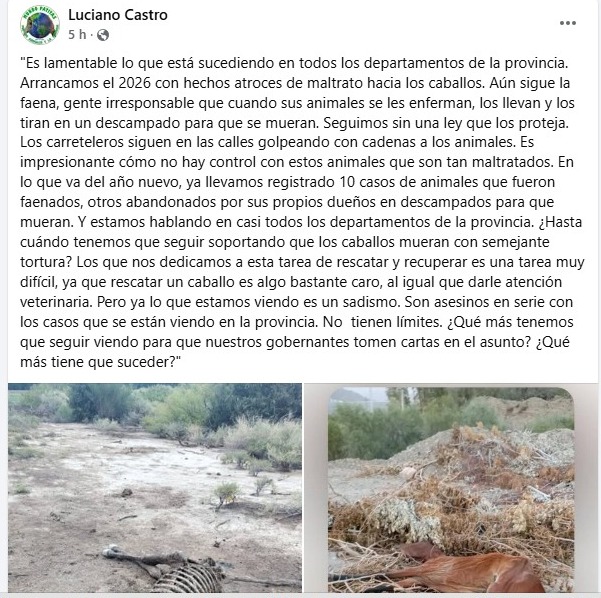 Un fuerte posteo difundido en redes sociales por un proteccionista volvió a instalar la problemática del maltrato extremo y la faena ilegal de caballos en distintos puntos de San Juan. Según la denuncia pública, en los primeros seis días de 2026 se registraron diez casos de animales faenados o abandonados.