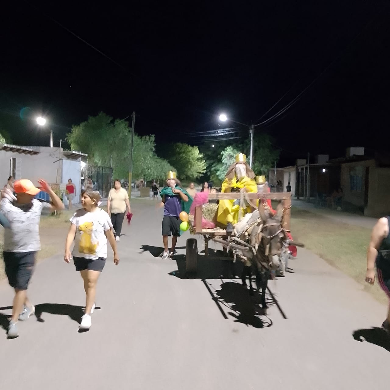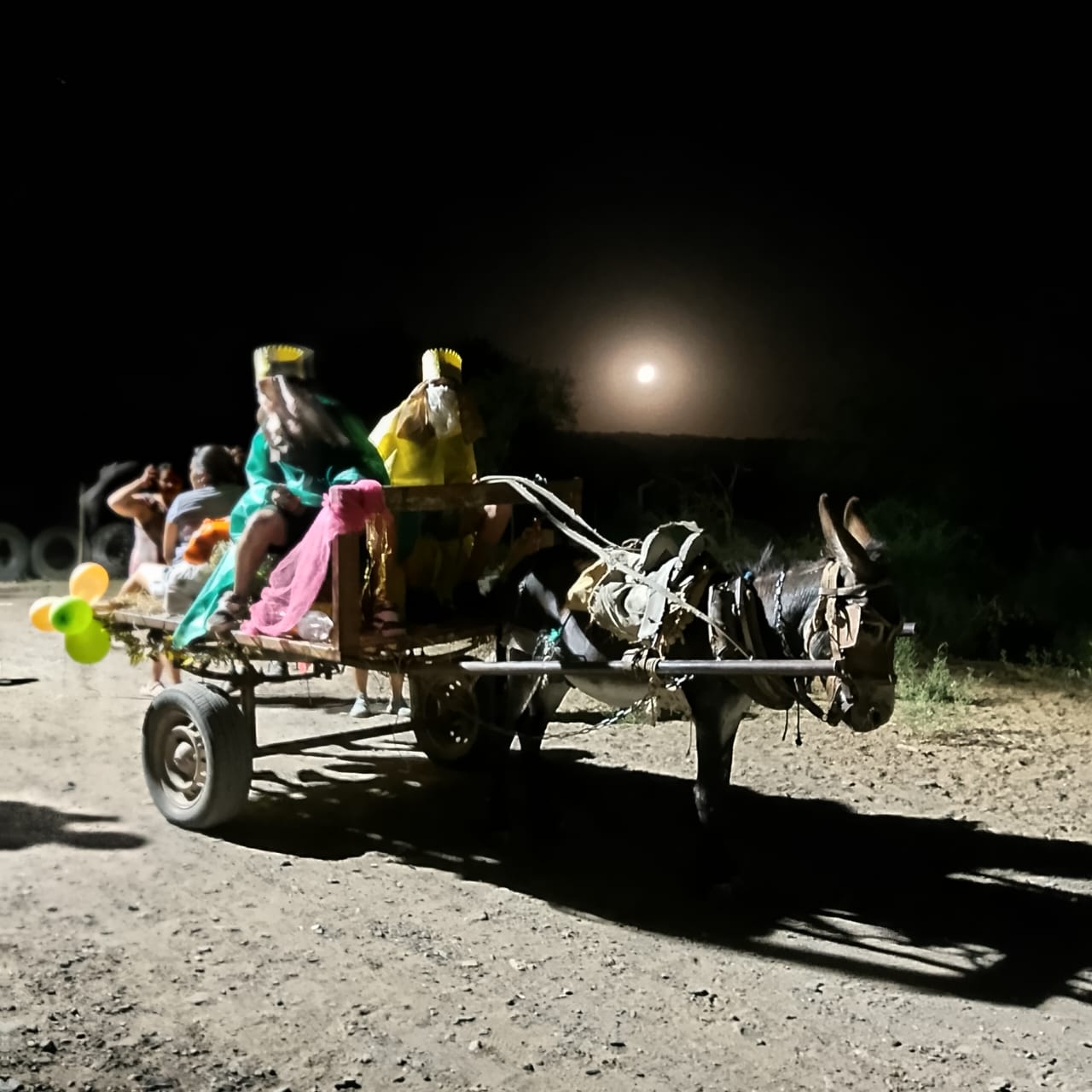 Bajo el brillo pleno de la luna y en un entorno de semioscuridad, las majestades recorrieron las polvorientas calles del lugar.