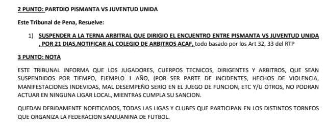 El presidente de la institución confirmó que el árbitro en cuestión ha sido suspendido por 21 días, pero consideró que la sanción es insuficiente. «No tenía que ser suspendido por días, sino tenía que ser suspendido ese árbitro por todo el campeonato de la Copa de Campeones», sentenció, abogando por un castigo ejemplar para evitar futuras irregularidades.