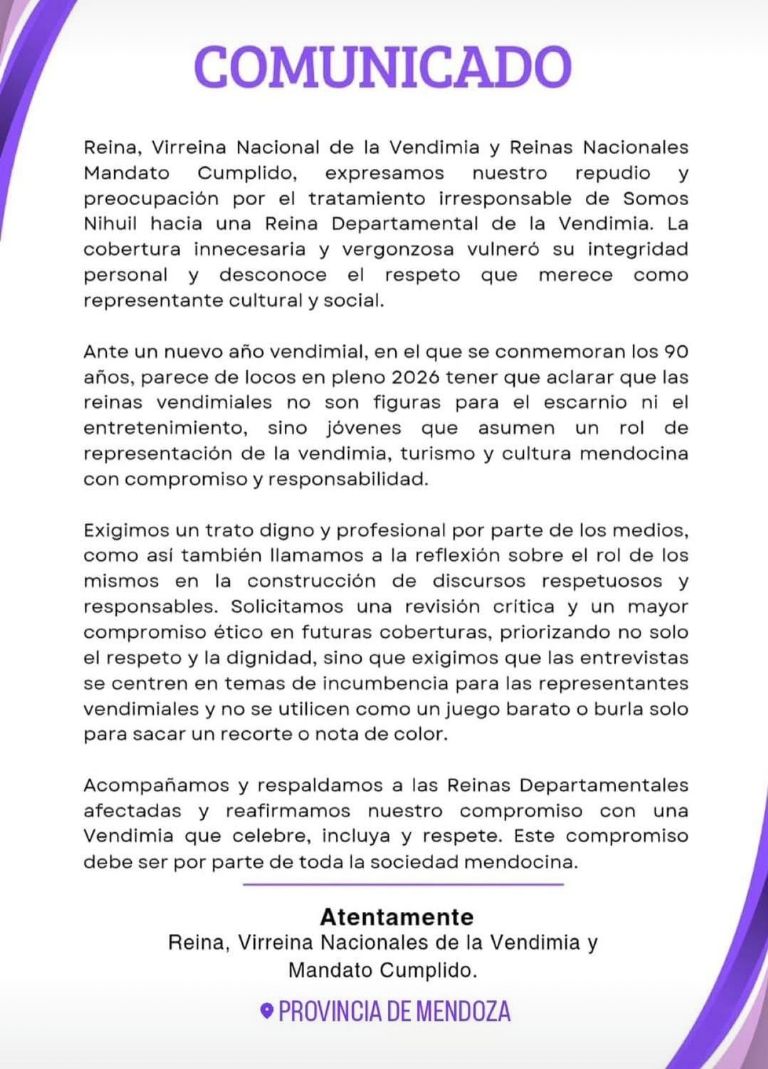 Tras la difusión del segmento, las reinas y virreinas de mandato cumplido compartieron un comunicado en redes sociales con el que “expresamos nuestro repudio y preocupación por el tratamiento irresponsable de Somos Nihuil hacia una reina departamental de la Vendimia. La cobertura innecesaria y vergonzosa vulneró su integridad personal y desconoce el respeto que merece como representante cultural y social”.